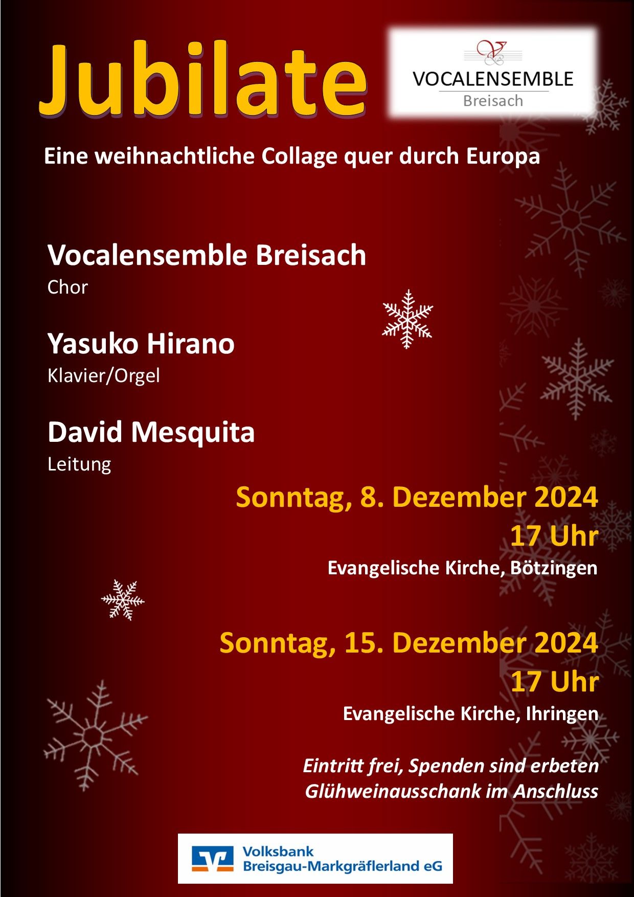 Unter dem Titel „Jubilate – eine weihnachtliche Collage quer durch Europa“ lädt das Vocalensemble Breisach zu zwei Adventskonzerten ein: am 8. Dezember 2024 um 17 Uhr in die evangelische Kirche Bötzingen und am 15. Dezember 2024 um 17 Uhr in die evangelische Kirche Ihringen. Mit weihnachtlich festlicher Musik setzt der Chor die Tradition seiner „Jubilate“-Aufführungen fort. Das Publikum darf sich auf ein von Chorleiter David Mesquita völlig neu konzipiertes Programm freuen. Die Liedfolge zeichnet den adventlichen Weg nach, beginnend mit der Vorankündigung und Erwartung bis hin zur Verkündigung der Geburt Christi und dem damit einhergehenden Jubel. Der musikalische Streifzug führt in dieser Collage nicht nur durch verschiedene zeitliche Epochen, sondern bedient sich auch unterschiedlicher europäischer Herkunftsländer: So werden neben deutschen Klassikern wie »Es ist ein Ros entsprungen« unter anderem Stücke aus spanischer, französischer, englischer, ungarischer oder schwedischer Feder (»Jul, Jul, Strålande Jul« von Gustav Nordqvist) vorgetragen. Yasuko Hirano begleitet die Darbietungen an Klavier und Orgel. Zu drei bekannten Werken darf das Publikum seiner weihnachtlichen Vorfreude selbst Ausdruck verleihen und ist herzlich dazu eingeladen mitzusingen. Der Eintritt ist frei, Spenden sind erbeten. Im Anschluss der Konzerte lassen jeweils Glühweinausschank und Fingerfood den Abend gemütlich ausklingen.